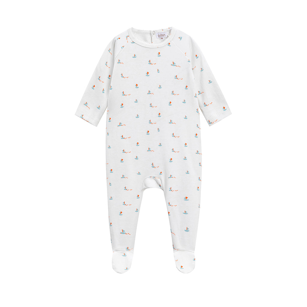 This stylish All-Over White Boat Print Footie with an optional hat is a must-have for any baby. Featuring a charming boat print, this set adds a playful touch while keeping your little one cozy and comfortable. Crafted from soft, warm fabric, it's perfect for daily wear or as a thoughtful addition to any baby’s wardrobe. Designed in Paris, France, this set combines elegance with everyday practicality.