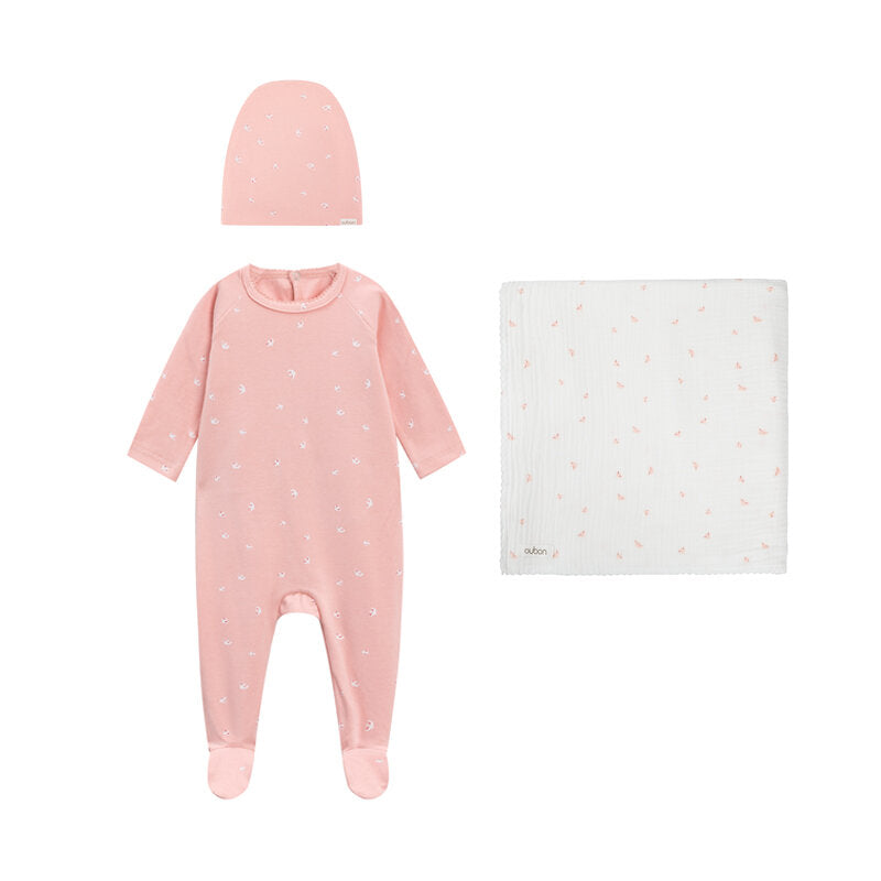 Our Pink Ground Bird Take ME Home Set is made from soft, breathable cotton and features an all over print of delicate white birds. Completing the look with the matching hat & blanket, providing warmth and comfort for your little one. Expertly crafted for a cozy and stylish addition to your baby's wardrobe.