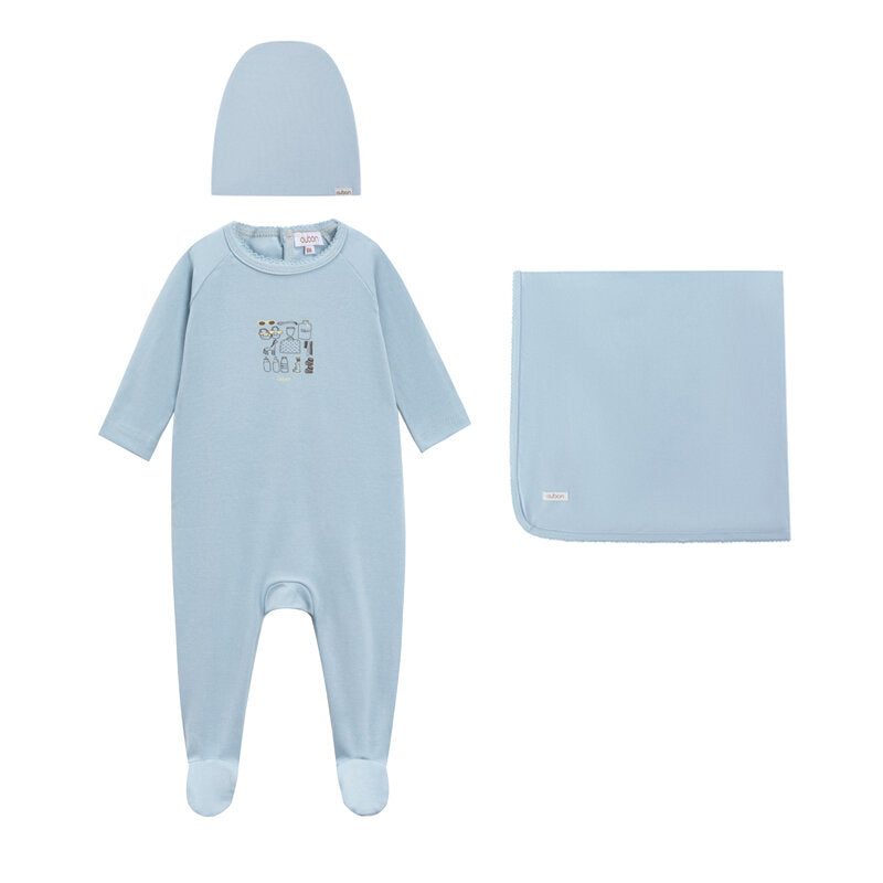 Wrap your little one in comfort with this blue footie and matching set. Crafted from ultra-soft cotton, it’s gentle on delicate skin while ensuring all-day coziness. The center print showcases a charming collection of baby essentials, including a bottle, pacifier, shoes, sunglasses, and more, adding a playful yet stylish touch. Available as a complete set with a coordinating hat and blanket, this ensemble is perfect for everyday wear or a thoughtful gift.