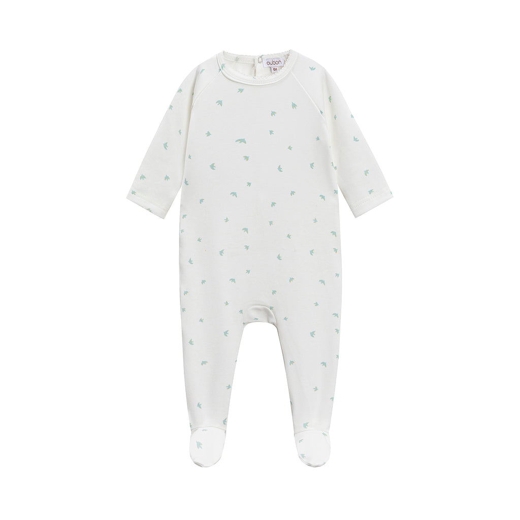 Add a playful touch to bedtime with our White Ground Blue Bird Footie. Made from soft cotton, this set features a charming blue bird print on a crisp white background. Add the matching hat to complete the look! Perfect for snuggles and snoozing!