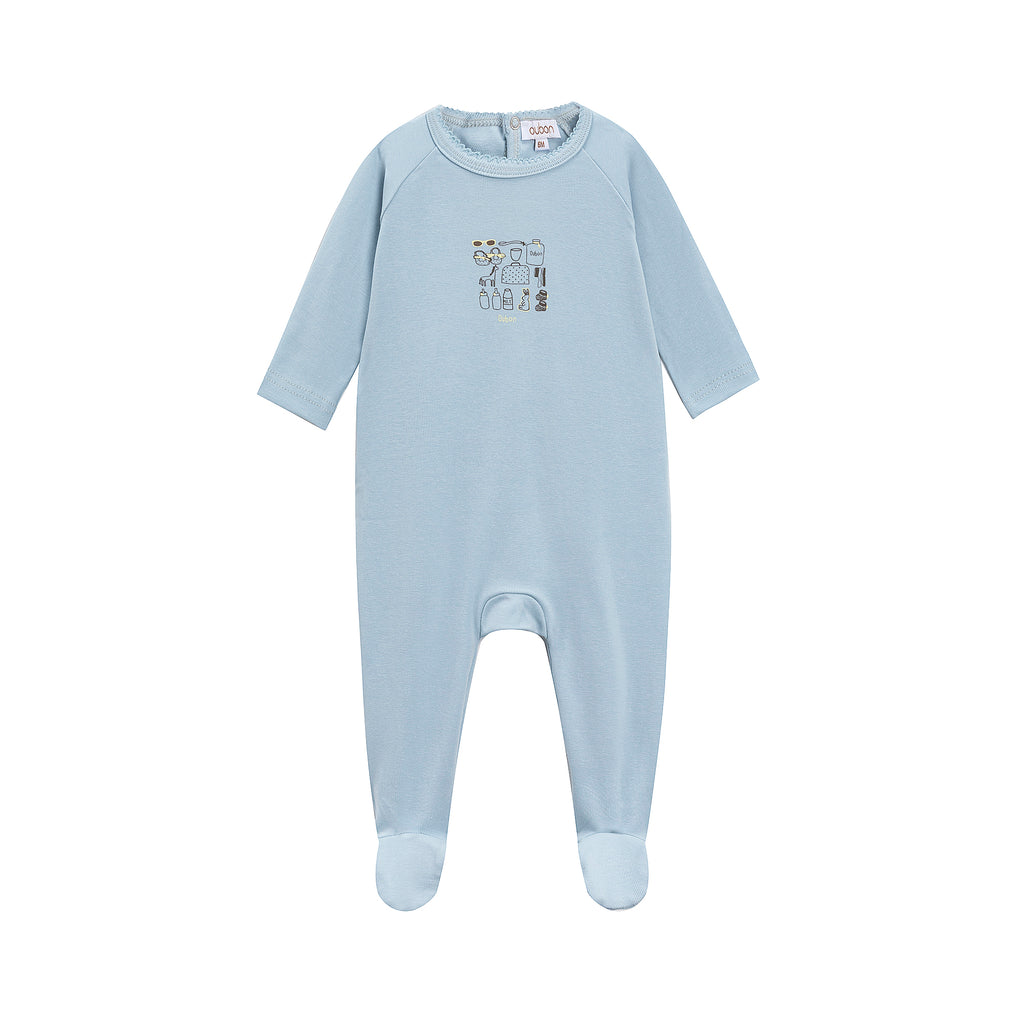 Keep your little one cozy and stylish in this blue footie, crafted from ultra-soft cotton for maximum comfort. The center print features a delightful collection of baby essentials, including a bottle, pacifier, shoes, sunglasses, and more, adding a playful touch to this adorable piece. Perfect for everyday wear, this footie combines practicality with charm, ensuring your baby stays snug and cute all day long.
