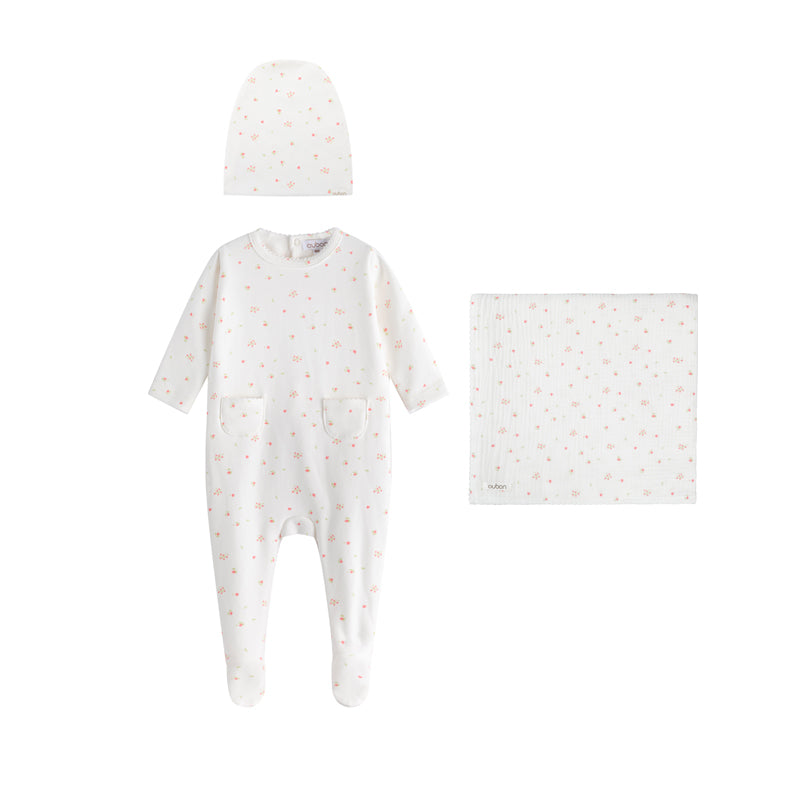 Elevate your baby's first moments with our Tulip Print White Ground Take Me Home Set. Made with a matching hat and swaddle, this set exudes sophistication and exclusivity. The delicate tulip print on a white background brings an artistic touch to your little one's outfit. Perfect for the most elegant babies.